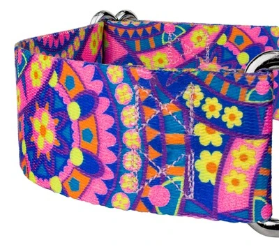 Is your escape artist slipping out of their collar? Martingale collars are designed to prevent your pup from pulling out of their collar by tightening around your dog’s neck whenever they try to remove their heads. Once your dog quits pulling, the collar relaxes again. Perfect for training, the twin-loop design gives you control over your stroll. The martingale collar is often referred to as a humane choke collar because it naturally limits how much it tightens, ensuring your dog’s safety. A no-slip, adjustable, limited choke collar is an excellent solution for sighthounds who slip out of their collars.Show your fashionista side with a 1 1/2 inch Blue Boho Mandala Martingale Dog Collar. This far out 1 1/2 Inch Martingale Dog Collar features funky color combinations that’ll show your pet’s chill nature. Bursts of blue flow throughout while numerous other vivid colors compliment the design. Printed using state-of-the-art colorfast inks, our collars will not run or bleed. Crafted from industry-leading hardware and webbing, Country Brook Petz’ 1 1/2 Inch Blue Boho Mandala Martingale Dog Collars stand up under tough conditions, all while keeping your furry friend looking fab.By adjusting the metal slide, you give slack to the loop. Slip it over your dog’s neck and decrease size until you can comfortably slip only two fingers under the collar. The unique limited closure prevents the choke from becoming too tight. We at Country Brook Petz pride ourselves on only using the best hardware, and you can rest assured that these collars will withstand whatever your pup gets into. Our collars have wide-mouthed heavy-duty triglides for easy adjustment and heavy-welded D-rings for strength.
