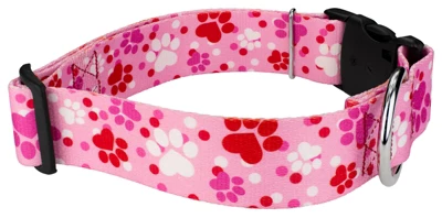 You’ll go mutts over Country Brook Petz’ Puppy Love 1 1/2 Inch Deluxe Dog Collar! Adorable shades of pink, red, and white puppy paw prints are scattered on a pretty pink background. A fetching pattern of paws with hearts encaptures pure perfection of puppy love!At the heart of this exceptional collar lies our premium polyester webbing, a high-strength and resilient material known for its remarkable durability. Whether your dog is a spirited explorer or a playful companion, this collar can withstand the test of time and keep up with their boundless energy.The sleek and smooth texture of the polyester webbing ensures a gentle touch against your dog’s neck, eliminating any discomfort or irritation. Your loyal companion will revel in the luxurious comfort that this collar provides, allowing them to strut their stuff with unmatched confidence.To further elevate the collar’s functionality, we constructed it with YKK brand buckles, renowned for their exceptional quality and reliability. These buckles are not only stylish but also incredibly secure, giving you peace of mind knowing that your furry friend is always safe and sound.The YKK brand buckles are engineered with precision, featuring a seamless interlocking mechanism that guarantees a secure fit. They are easy to use and offer a hassle-free experience, allowing you to fasten and release the collar with a simple snap effortlessly. Whether you’re preparing for a leisurely stroll or an exciting outdoor adventure, this collar ensures quick and convenient handling.Besides its undeniable elegance, our Deluxe Dog Collar is also equipped with a sturdy welded D-ring for easy leash attachment. This feature guarantees a seamless transition from playtime to outdoor walks, allowing you to maintain control without compromising on style or comfort.Indulge your furry friend in the opulence they deserve with our Deluxe Dog Collar. From the premium polyester webbing to the renowned YKK brand buckles, every aspect of this collar is a testament to superior craftsmanship and unparalleled quality made right here in America. Give your loyal companion the gift of comfort and style, and watch them turn heads wherever they go.