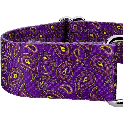 Is your escape artist slipping out of their collar? Martingale collars are designed to prevent your pup from pulling out of their collar by tightening around your dog’s neck whenever they try to remove their heads. Once your dog quits pulling, the collar relaxes again. Perfect for training, the twin-loop design gives you control over your stroll. The martingale collar is often referred to as a humane choke collar because it naturally limits how much it tightens, ensuring your dog’s safety. A no-slip, adjustable, limited choke collar is an excellent solution for sighthounds who slip out of their collars.Martingale Dog Collar is to bring you the traditional print of paisley with vivid colors that make everything pop. This ornamental, Persian inspired design features a smooth floral-like pattern, flowing lines, and complimentary colors that will contrast against your applications; this classic composition will be a hot item for all-year-round use. Printed using state-of-the-art colorfast inks, our collars will not run or bleed. Crafted from industry-leading hardware and webbing, Country Brook Petz’ Purple Paisley Martingale Dog Collars stand up under tough conditions, all while keeping your furry friend looking fab.By adjusting the metal slide, you give slack to the loop. Slip it over your dog’s neck and decrease size until you can comfortably slip only two fingers under the collar. The unique limited closure prevents the choke from becoming too tight. We at Country Brook Petz pride ourselves on only using the best hardware, and you can rest assured that these collars will withstand whatever your pup gets into. Our collars have wide-mouthed heavy-duty triglides for easy adjustment and heavy-welded D-rings for strength.