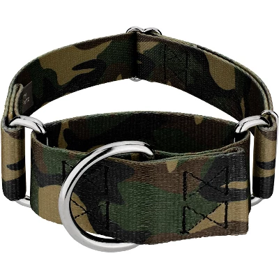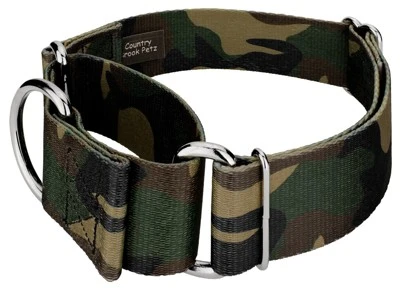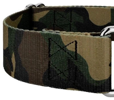 Is your escape artist slipping out of their collar? Martingale collars are designed to prevent your pup from pulling out of their collar by tightening around your dogโs neck whenever they try to remove their heads. Once your dog quits pulling, the collar relaxes again. Perfect for training, the twin-loop design gives you control over your stroll. The martingale collar is often referred to as a humane choke collar because it naturally limits how much it tightens, ensuring your dog’s safety. A no-slip, adjustable, limited choke collar is an excellent solution for sighthounds who slip out of their collars.Country Brook Petz’ Woodland Camo 1 1/2 Inch Martingale Dog Collar will give your pup the outdoor lifestyle you crave. This classic camouflage pattern features rich browns, hunter greens, and tans in large blotches; larger blotches allow for more cover at greater distances. Printed using state-of-the-art colorfast inks, our collars will not run or bleed. Crafted from industry-leading hardware and webbing, Country Brook Petzโ 1 1/2 Inch Woodland Camo Martingale Dog Collars stand up under tough conditions, all while keeping your furry friend looking fab.By adjusting the metal slide, you give slack to the loop. Slip it over your dog’s neck and decrease size until you can comfortably slip only two fingers under the collar. The unique limited closure prevents the choke from becoming too tight. We at Country Brook Petz pride ourselves on only using the best hardware, and you can rest assured that these collars will withstand whatever your pup gets into. Our collars have wide-mouthed heavy-duty triglides for easy adjustment and heavy-welded D-rings for strength.