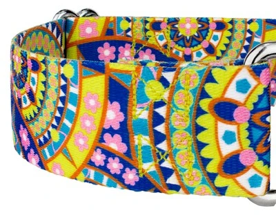 Is your escape artist slipping out of their collar? Martingale collars are designed to prevent your pup from pulling out of their collar by tightening around your dog’s neck whenever they try to remove their heads. Once your dog quits pulling, the collar relaxes again. Perfect for training, the twin-loop design gives you control over your stroll. The martingale collar is often referred to as a humane choke collar because it naturally limits how much it tightens, ensuring your dog’s safety. A no-slip, adjustable, limited choke collar is an excellent solution for sighthounds who slip out of their collars.Get your free spirit on with our 1 1/2 Inch Yellow Boho Mandala Martingale Dog Collar. This far out 1 1/2 Inch Martingale Dog Collar features funky color combinations that’ll show your pet’s chill nature. Bursts of yellow flow throughout while numerous other vivid colors compliment the design. Printed using state-of-the-art colorfast inks, our collars will not run or bleed. Crafted from industry-leading hardware and webbing, Country Brook Petz’ 1 1/2 Inch Yellow Boho Mandala Martingale Dog Collars stand up under tough conditions, all while keeping your furry friend looking fab.By adjusting the metal slide, you give slack to the loop. Slip it over your dog’s neck and decrease size until you can comfortably slip only two fingers under the collar. The unique limited closure prevents the choke from becoming too tight. We at Country Brook Petz pride ourselves on only using the best hardware, and you can rest assured that these collars will withstand whatever your pup gets into. Our collars have wide-mouthed heavy-duty triglides for easy adjustment and heavy-welded D-rings for strength.