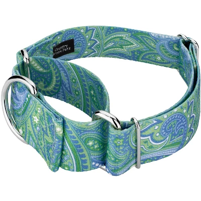 Enjoy this sophisticated Green Paisley Martingale Dog Collar from Country Brook Petz. Featuring a classy blue and green paisley design, your pet will feel debonair while sporting this pattern. The heavy duty polyester webbing used to make our collars is printed using color-fast dye that will not run or streak. Also, the sublimated design is double sided so you can enjoy this pattern on or off your furry friend. Featuring a two inch width, this collar is great for large breed dogs. Created from superior hardware and webbing, Country Brook Petz’ Green Paisley Martingale Dog Collars will not only provide your pup with a trendy collar, but will give you a sense of ease when using our products. Are you tired of chasing your dog once they’ve escaped from their collar? Well, our martingale collars are designed to prevent your pup from pulling out or pulling away. First, the martingale “loop” tightens around your dog’s neck whenever they try to remove their head. Once they stop pulling, the collar relaxes against their neck. Perfect for training, the twin loop design gives you control over your stroll. The martingale collar is often referred to as a humane choke collar. A no-slip, adjustable-choke collar is an excellent solution for sighthounds who slip out of their collars. By adjusting the metal slide, you give slack to the loop. Slip it over your dog’s neck and decrease size until you can comfortably slip only a couple of fingers under the collar. The unique limited closure prevents the choke from becoming too tight. We at Country Brook Petz pride ourselves on only using the best hardware and you can rest assured that these collars will withstand whatever your pup brings its way. Our collars have wide-mouthed heavy-duty triglides for easy adjustment and heavy-welded D-rings for your dog’s safety. Designed to make your dog safer on a leash, this training collar gives you back control.