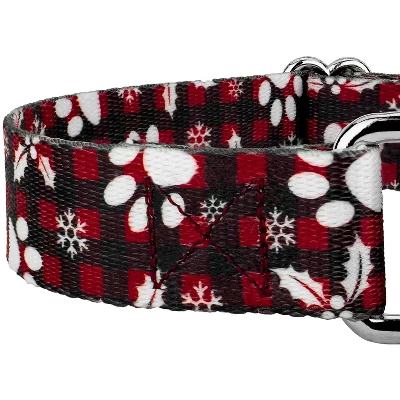 Is your escape artist slipping out of their collar? Martingale collars are designed to prevent your pup from pulling out of their collar by tightening around your dog’s neck whenever they try to remove their heads. Once your dog quits pulling, the collar relaxes again. Perfect for training, the twin-loop design gives you control over your stroll. The martingale collar is often referred to as a humane choke collar because it naturally limits how much it tightens, ensuring your dog’s safety. A no-slip, adjustable, limited choke collar is an excellent solution for sighthounds who slip out of their collars.This Christmas Plaid Dog Collars gives you the down home country Christmas you’ve been dreaming of. This classic buffalo plaid pattern is enhanced with snow white paw prints, eternal holly, and fluffy snowflakes. Printed using state-of-the-art colorfast inks, our collars will not run or bleed. Crafted from industry-leading hardware and webbing, Country Brook Petz’ Christmas Plaid Martingale Dog Collars stand up under tough conditions, all while keeping your furry friend looking fab.By adjusting the metal slide, you give slack to the loop. Slip it over your dog’s neck and decrease size until you can comfortably slip only two fingers under the collar. The unique limited closure prevents the choke from becoming too tight. We at Country Brook Petz pride ourselves on only using the best hardware, and you can rest assured that these collars will withstand whatever your pup gets into. Our collars have wide-mouthed heavy-duty triglides for easy adjustment and heavy-welded D-rings for strength.