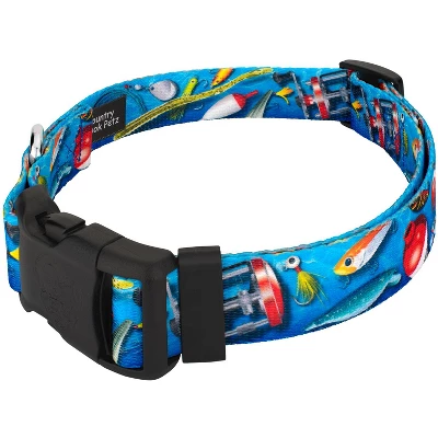 Country Brook Petz’ Gone Fishin’ Dog Collar and Leash is the catch of a lifetime. Red Bobbers float, and lures swim among the shimmering water background. You can almost hear the splashing of your next catch with this design. Printed using our colorfast dye, there are no runs or bleeding onto your pupper. Made from superior hardware and webbing, Country Brook Petz’ Gone Fishin’ Deluxe Dog Collar & Leash will provide you with a sense of ease when using our products. This Gone Fishin’ collar and leash set are uniquely designed and have a silky smooth polyester loop that slips over your hand, giving you a comfortable grip while walking your pet. Box stitching ensures strength for when your pup pulls against their leash. These collars and leashes are washable, with mild detergent, and dry when laid out.The Extra Small, Mini and Micro are still reliable with a 700 lb. tensile strength, even though they may seem delicate.We know that you want the best for your pets, that’s why we make all of our products here in the United States. Equipped with wide-mouthed, heavy-duty triglides for easy adjustment, and heavy-welded d-rings for your dog’s security. Leashes are constructed with high grade snap hooks and polyester that ensures your puppy won’t break the leash. Walk your pup with confidence knowing that Country Brook Petz has you in mind when creating our products. Style isn’t all we have going for our collars and leashes!Country Brook Design cannot be held responsible for misuse of this product. It is the responsibility of the purchaser to determine the suitability of the product for their use.