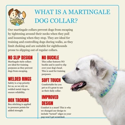 Is your escape artist slipping out of their collar? Martingale collars are designed to prevent your pup from pulling out of their collar by tightening around your dog’s neck whenever they try to remove their heads. Once your dog quits pulling, the collar relaxes again. Perfect for training, the twin-loop design gives you control over your stroll. The martingale collar is often referred to as a humane choke collar because it naturally limits how much it tightens, ensuring your dog’s safety. A no-slip, adjustable, limited choke collar is an excellent solution for sighthounds who slip out of their collars.Breathe in the aroma of springtime with this 1 1/2 Inch Martingale Dog Collar Spring Collection. Featuring bunnies, eggs, florals, and all things Spring. Printed using state-of-the-art colorfast inks, our collars will not run or bleed. Crafted from industry-leading hardware and webbing, Country Brook Petz’ 1 1/2 Inch Spring Collection of Martingale Dog Collars stand up under tough conditions, all while keeping your furry friend looking fab.By adjusting the metal slide, you give slack to the loop. Slip it over your dog’s neck and decrease size until you can comfortably slip only two fingers under the collar. The unique limited closure prevents the choke from becoming too tight. We at Country Brook Petz pride ourselves on only using the best hardware, and you can rest assured that these collars will withstand whatever your pup gets into. Our collars have wide-mouthed heavy-duty triglides for easy adjustment and heavy-welded D-rings for strength.Country Brook Design cannot be held responsible for misuse of this product. It is the responsibility of the purchaser to determine the suitability of the product for their use.
