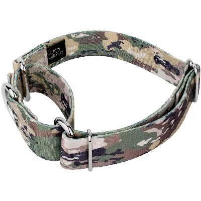 Strike your prey with Country Brook Petz’ Mountain Viper Camo Martingale Dog Collar. Earthy tans, softened greens, and light browns create a color pattern that is indicative of mountain forestry. The chameleon-like camo allows you to hide in plain sight and creates an ideal cover for fallen foliage or piles of leaves. Small and sporadic colors create the illusion of mimicry and allow your pup to blend in naturally with their surroundings. Printed using our colorfast dye, there are no runs or bleeding onto your pupper. Made from superior hardware and webbing, Country Brook Petz’ Mountain Viper Camo Martingale Dog Collar will provide you with not only trendy pup attire, but a sense of ease when using our products. Is your good boy or girl slipping out of their collar? Well, our martingale collars are designed to prevent your pup from pulling out of their collar by tightening around your dog’s neck whenever they try to remove their heads. Once Fido quits pulling, the collar relaxes against their neck. Perfect for training, the twin loop design gives you control over your stroll. The martingale collar is often referred to as a humane choke collar. A no-slip, adjustable-choke collar is an excellent solution for sighthounds who slip out of their collars. The Extra Small, Mini and Micro are still reliable with a 700 lb. tensile strength, even though they may seem delicate.By adjusting the metal slide, you give slack to the loop. Slip it over your dog’s neck and decrease size until you can comfortably slip only a couple of fingers under the collar. The unique limited closure prevents the choke from becoming too tight. We at Country Brook Petz pride ourselves on only using the best hardware and you can rest assured that these collars will withstand whatever your pup brings its way. Our collars have wide-mouthed heavy-duty triglides for easy adjustment and heavy-welded D-rings for strength. Designed to give you back control while your pup is leashed.