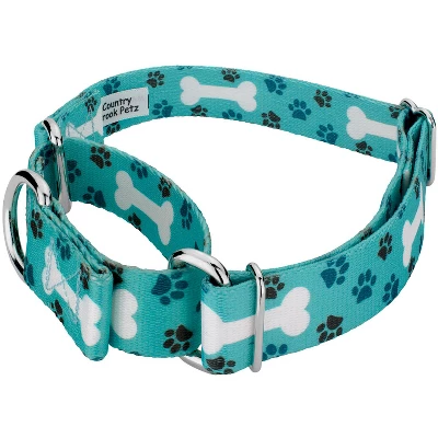 Bark up the right tree with our Martingale Oh My Dog Collar & Leash. A beautiful teal background features paw prints scattered throughout the design with prominent white bones standing out from the collar and leash set. You’ll be rolling over with excitement over how cute this pattern is! When you order this dog collar and leash set, you will receive a martingale collar and a matching leash; collar size of your choice with an accompanying 6 foot leash. These Oh My Dog collar and leash sets are uniquely designed and have a silky smooth polyester loop that slips over your hand, giving you a comfortable grip while walking your pet; box stitching ensures strength for when your pup pulls against their leash.The Extra Small, Mini and Micro are still reliable with a 700 lb. tensile strength, even though they may seem delicate.Our martingale collars are designed to prevent your pup from pulling out of their collar by tightening around your dog’s neck whenever they try to remove their heads. Perfect for training, the twin loop design gives you control over your stroll. By adjusting the metal slide, you give slack to the loop. Slip it over your dog’s neck and decrease size until you can comfortably slip only a couple of fingers under the collar. The unique limited closure prevents the choke from becoming too tight. We at Country Brook Petz pride ourselves on only using the best hardware and you can rest assured that these collars will withstand whatever your pup brings its way. Our collars have wide-mouthed heavy-duty triglides for easy adjustment and heavy-welded D-rings for strength. Designed to give you back control while your pup is leashed.