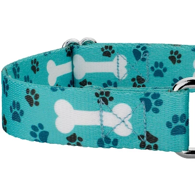 Bark up the right tree with our Oh My Dog Martingale Dog Collars. A beautiful teal background features paw prints scattered throughout the design with prominent white bones standing out from the collar. You’ll be rolling over with excitement over how cute this pattern is! Printed using our colorfast dye, our collars will not run or bleed. Created from superior hardware and webbing, Country Brook Petz’ Oh My Dog Martingale Dog Collars will not only provide your pup with a trendy collar, but will give you a sense of ease when using our products.Is your good boy or girl slipping out of their collar? Well, our martingale collars are designed to prevent your pup from pulling out of their collar by tightening around your dog’s neck whenever they try to remove their heads. Once Fido quits pulling, the collar relaxes against their neck. Perfect for training, the twin loop design gives you control over your stroll. The martingale collar is often referred to as a humane choke collar. A no-slip, adjustable-choke collar is an excellent solution for sighthounds who slip out of their collars.The Extra Small, Mini and Micro are still reliable with a 700 lb. tensile strength, even though they may seem delicate.By adjusting the metal slide, you give slack to the loop. Slip it over your dog’s neck and decrease size until you can comfortably slip only a couple of fingers under the collar. The unique limited closure prevents the choke from becoming too tight. We at Country Brook Petz pride ourselves on only using the best hardware and you can rest assured that these collars will withstand whatever your pup brings its way. Our collars have wide-mouthed heavy-duty triglides for easy adjustment and heavy-welded D-rings for strength. Designed to give you back control while your pup is leashed.