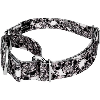 Is your escape artist slipping out of their collar? Martingale collars are designed to prevent your pup from pulling out of their collar by tightening around your dog’s neck whenever they try to remove their heads. Once your dog quits pulling, the collar relaxes again. Perfect for training, the twin-loop design gives you control over your stroll. The martingale collar is often referred to as a humane choke collar because it naturally limits how much it tightens, ensuring your dog’s safety. A no-slip, adjustable, limited choke collar is an excellent solution for sighthounds who slip out of their collars.Whether you’re into metal, rock, bikes or anything macabre, this Phantom Skulls Martingale Dog Collar allows you to show your dark side. Rugged skulls are placed in a stacked arrangement featuring pops of white and desolate pitch-blacks. Printed using state-of-the-art colorfast inks, our collars will not run or bleed. Crafted from industry-leading hardware and webbing, Country Brook Petz’ Phantom Skulls Martingale Dog Collars stand up under tough conditions, all while keeping your furry friend looking fab.By adjusting the metal slide, you give slack to the loop. Slip it over your dog’s neck and decrease size until you can comfortably slip only two fingers under the collar. The unique limited closure prevents the choke from becoming too tight. We at Country Brook Petz pride ourselves on only using the best hardware, and you can rest assured that these collars will withstand whatever your pup gets into. Our collars have wide-mouthed heavy-duty triglides for easy adjustment and heavy-welded D-rings for strength.Country Brook Design cannot be held responsible for misuse of this product. It is the responsibility of the purchaser to determine the suitability of the product for their use.