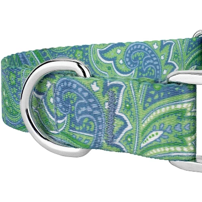 Enjoy this sophisticated Green Paisley Premium Dog Collar and Leash from Country Brook Petz. Featuring a classy blue and green paisley design, you’ll feel debonair while sporting this pattern. Printed using our colorfast dye, our collars will not run or bleed. Created from superior hardware and webbing, Country Brook Petz’ Premium Dog Collar and Leash will not only provide your pup with a trendy collar, but will give you a sense of ease when using our products. When you order this dog collar and leash set, you will receive a premium collar and a matching leash; collar size of your choice with an accompanying 6 foot leash.These collar and leash sets are uniquely designed and have a silky smooth polyester loop that slips over your hand, giving you a comfortable grip while walking your pet; box stitching ensures strength for when your pup pulls against their leash. These collars and leashes are washable, with mild detergent, and dry when laid out. Country Brook Petz’ premium patterned collars are vibrant, comfortable collars made right here in the U.S.A. These collars are constructed using strong polyester webbing, dependable metal side release buckles that feature a brilliant mirror finish, heavy-duty wide-mouthed triglides, and heavy welded D-rings.We want your furbaby to be able to show the world their new collar immediately, so be sure to measure for the right size. You can check this out by using a string, or tape measure, to see where the collar will fit snugly and comfortably on your dog’s neck. These stylish prints work well with both boy and girl puppers.