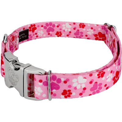 You’ll go mutts over Country Brook Petz’ Puppy Love Premium Dog Collar! Adorable shades of pink, red, and white puppy paw prints are scattered on a pretty pink background. A fetching pattern of paws with hearts encapture pure perfection of puppy love! Printed using our colorfast dye, our collars will not run or bleed. Created from superior hardware and webbing, Country Brook Petz’ Puppy Love Premium Dog Collars will not only provide your pup with a trendy collar, but will give you a sense of ease when using our products.Country Brook Petz’ premium patterned collars are vibrant, comfortable collars made right here in the U.S.A. These collars are constructed using strong polyester webbing, dependable metal side release buckles that feature a brilliant mirror finish, heavy-duty wide-mouthed triglides, and heavy welded D-rings. Our polyester collars are ribbed, soft, and sleek to the touch with a little bit of a sheen. Country Brook makes all their collars after the order has been placed. However, rest assured as your collar will ship within two business days of receiving payment.We want your furbaby to be able to show the world their new collar immediately, so be sure to measure for the right size. You can check this out by using a string, or tape measure, to see where the collar will fit snugly and comfortably on your dog’s neck. These stylish prints work well with both boy and girl puppers.