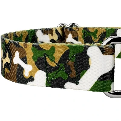 Are you bone tired of all the other camo prints out there? Well, Country Brook Petz has their own “bad to the bone” design that will compliment your camouflaged pup. Contrasting shades of brown, green, and a pop of white, highlight the bone accents perfectly while giving you a unique composition of design. Printed using our colorfast dye, there are no runs or bleeding onto your pupper. Made from superior hardware and webbing, Country Brook Petz’ Woodland Bone Camo Martingale Dog Collar will provide you with not only trendy pup attire, but a sense of ease when using our products. Is your good boy or girl slipping out of their collar? Well, our martingale collars are designed to prevent your pup from pulling out of their collar by tightening around your dog’s neck whenever they try to remove their heads. Once Fido quits pulling, the collar relaxes against their neck. Perfect for training, the twin loop design gives you control over your stroll. The martingale collar is often referred to as a humane choke collar. A no-slip, adjustable-choke collar is an excellent solution for sighthounds who slip out of their collars. The Extra Small, Mini and Micro are still reliable with a 700 lb. tensile strength, even though they may seem delicate.By adjusting the metal slide, you give slack to the loop. Slip it over your dog’s neck and decrease size until you can comfortably slip only a couple of fingers under the collar. The unique limited closure prevents the choke from becoming too tight. We at Country Brook Petz pride ourselves on only using the best hardware and you can rest assured that these collars will withstand whatever your pup brings its way. Our collars have wide-mouthed heavy-duty triglides for easy adjustment and heavy-welded D-rings for strength. Designed to give you back control while your pup is leashed.