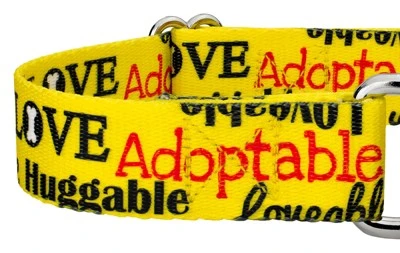 Show admiration for your loveable, huggable, adoptable rescue pet with this Yellow Loveable Rescue Martingale Dog Collar. Featuring a sunny yellow background with bold wording and adorable animals, this design will let everyone know your heart belongs to your adopted best friend. Printed using our colorfast dye, our collars will not run or bleed. Created from superior hardware and webbing, Country Brook Petz’ Yellow Loveable Rescue Martingale Dog Collars will not only provide your pup with a trendy collar, but will give you a sense of ease when using our products.Is your good boy or girl slipping out of their collar? Well, our martingale collars are designed to prevent your pup from pulling out of their collar by tightening around your dog’s neck whenever they try to remove their heads. Once Fido quits pulling, the collar relaxes against their neck. Perfect for training, the twin loop design gives you control over your stroll. The martingale collar is often referred to as a humane choke collar. A no-slip, adjustable-choke collar is an excellent solution for sighthounds who slip out of their collars.The Extra Small, Mini and Micro are still reliable with a 700 lb. tensile strength, even though they may seem delicate.By adjusting the metal slide, you give slack to the loop. Slip it over your dog’s neck and decrease size until you can comfortably slip only a couple of fingers under the collar. The unique limited closure prevents the choke from becoming too tight. We at Country Brook Petz pride ourselves on only using the best hardware and you can rest assured that these collars will withstand whatever your pup brings its way. Our collars have wide-mouthed heavy-duty triglides for easy adjustment and heavy-welded D-rings for your dog’s safety. Designed to make your dog safer on a leash, this training collar gives you back control.